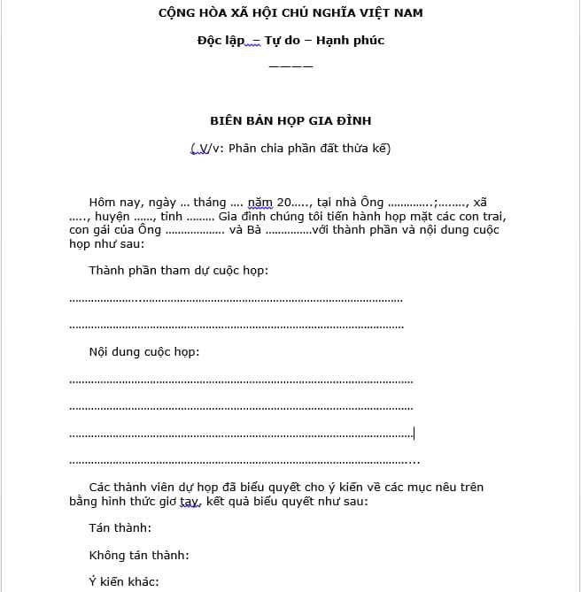 Biên bản họp gia đình khi phân chia di sản thừa kế. Mẫu biên bản họp gia đình phân chia di sản thừa kế được quy định như thế nào? Phải lưu ý những gì khi viết biên bản họp gia đình khi phân chia di sản thừa kế?