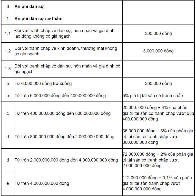 Tại tiểu mục 1.3, Mục II Danh mục án phí, lệ phí Tòa án Ban hành kèm theo Nghị quyết 326/2016/UBTVQH14 quy định: