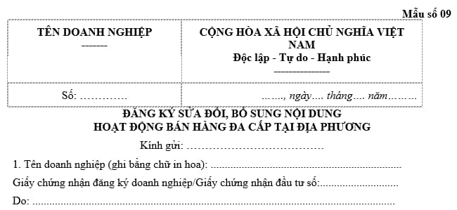 Cho tôi hỏi, mẫu đơn đăng ký sửa đổi bổ sung nội dung hoạt động bán hàng đa cấp tại địa phương năm 2023 như thế nào? Nhờ anh chị giải đáp