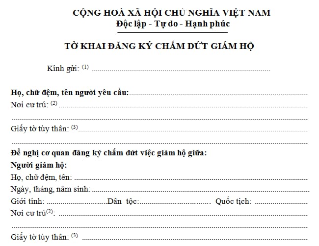 Mẫu tờ khai đăng ký chấm dứt giám hộ mới nhất? Xin hỏi: Mẫu tờ khai đăng ký chấm dứt giám hộ mới nhất?