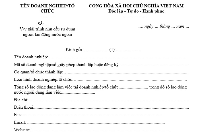Cho tôi hỏi là mẫu văn bản giải trình về nhu cầu sử dụng người lao động nước ngoài theo Nghị định 70 quy định thế nào? Mong được giải đáp vướng mắc!